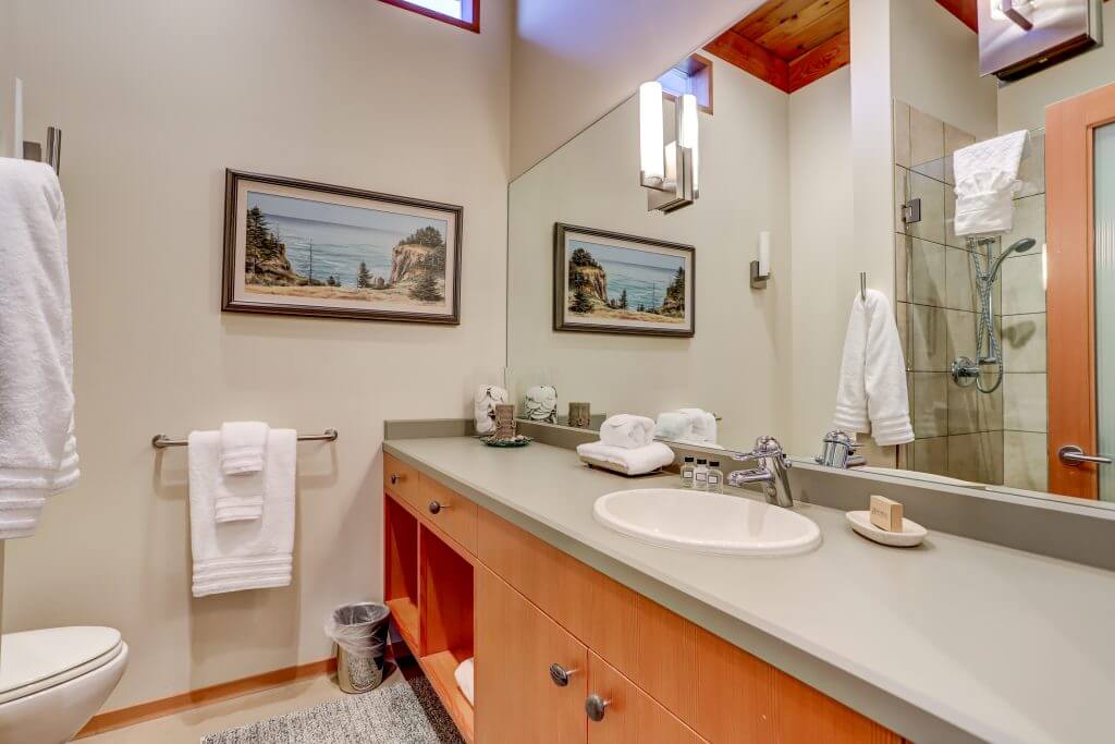 Luxury bath linens & travel-sized shower amenities provided. Full washer-dryer with laundry soap provided.